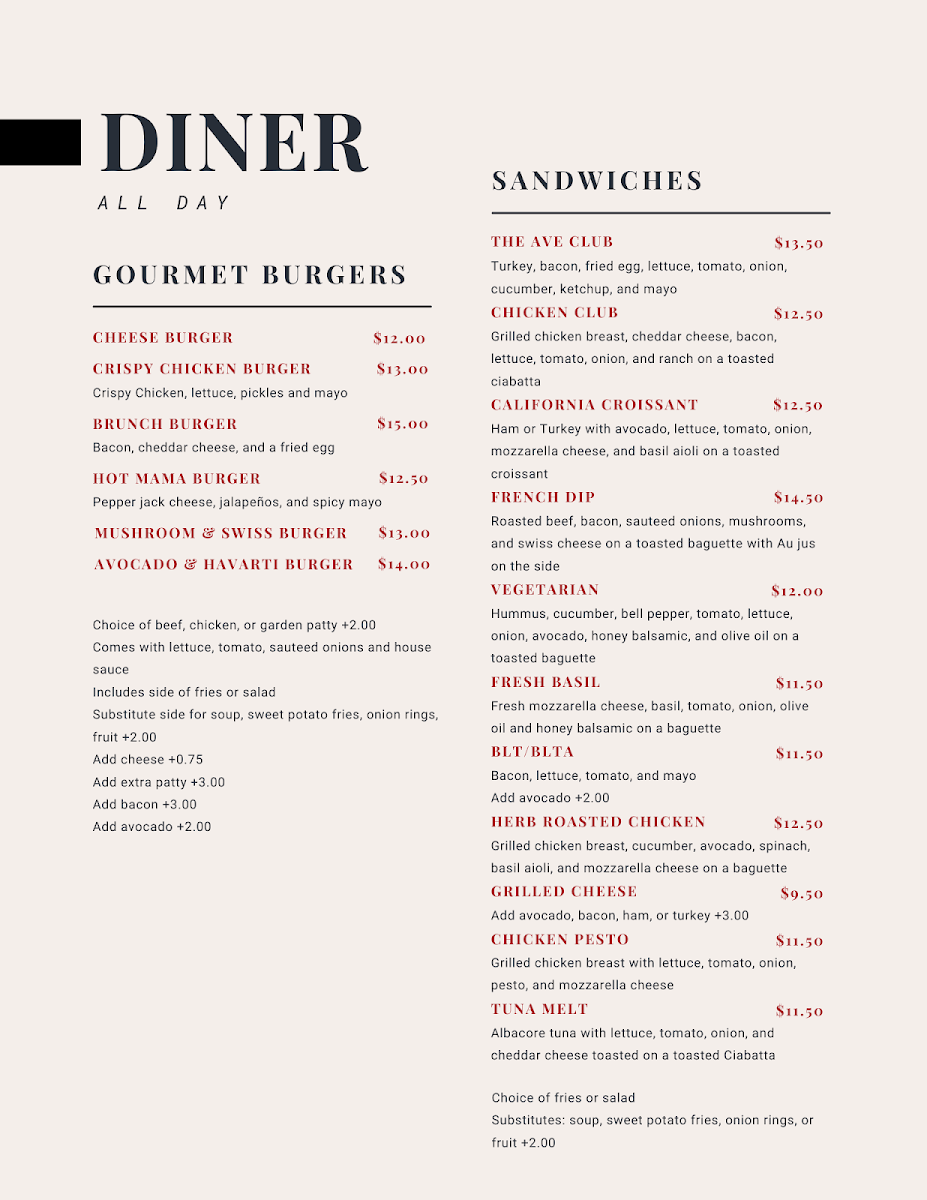Welcome to Cafe on the Ave, a delightful spot nestled on the bustling Avenue, where culinary creativity and a vibrant atmosphere collide. This café has become a beloved gem among locals and visitors alike, offering an inviting ambiance that's reminiscent of a cozy coffee shop paired with the energy of a lively eatery. With a friendly staff, peppy music, and the added bonus of free Wi-Fi, it sets the perfect stage for everything from casual meetings to friendly catch-ups.